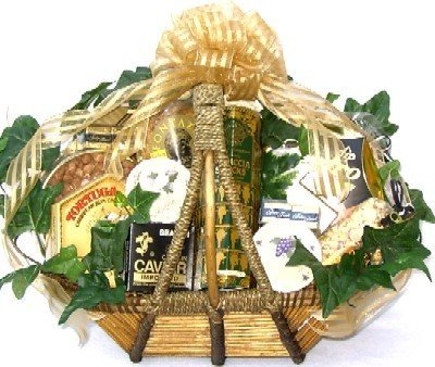 This very attractive, over-sized basket is accented with ivy and adorned with golden ribbon and piled high with a large selection of gift basket village favorites including, a box of hickory smoked almonds, pistachios, butter toffee peanuts, a large box of assorted chocolate dipped cookies, dark chocolate mint cream filled cookies, biscotti, wine-cheese-caviar crackers, black caviar imported from Iceland, white zinfandel Havarti cheese spread, chardonnay Havarti cheese spread and cabernet sauvignon cheddar, Cayman island rum cake, aged parmesan authentic focaccia snacks, honey mustard pretzels, chocolate drizzled popcorn and butter crunch caramel corn. Wow, are you feeling a little bit hungry too?Feature