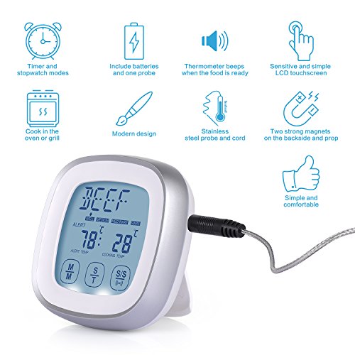 Adoric Touchscreen Digital Meat Thermometer with Timer Alert, Food Grade Probe for Kitchen Cooking, BBQ, Grill (Battery Included)