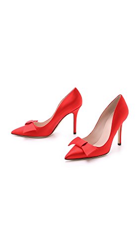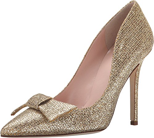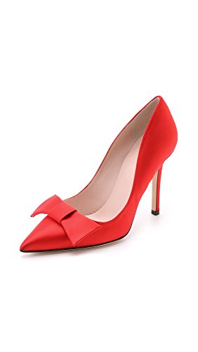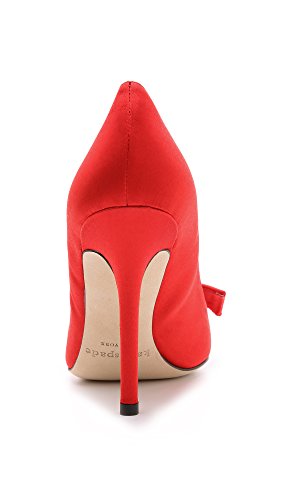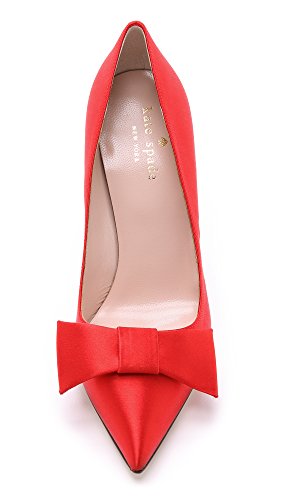 Ladylike Kate Spade New York pumps in lustrous satin. Bow at vamp. Covered stiletto heel and leather sole.