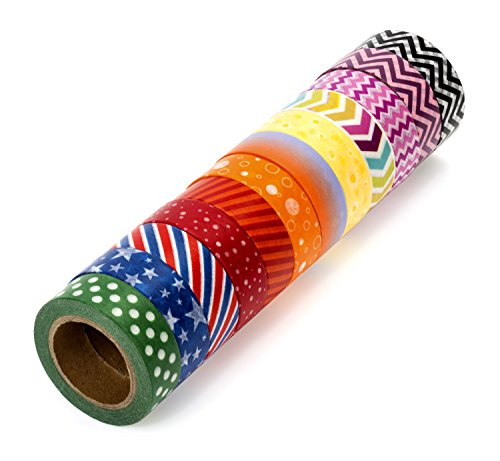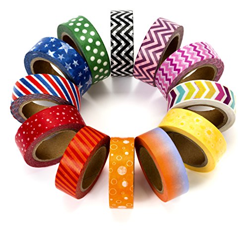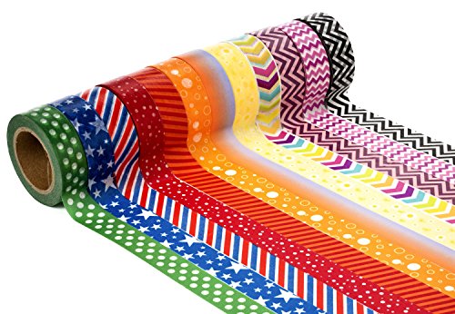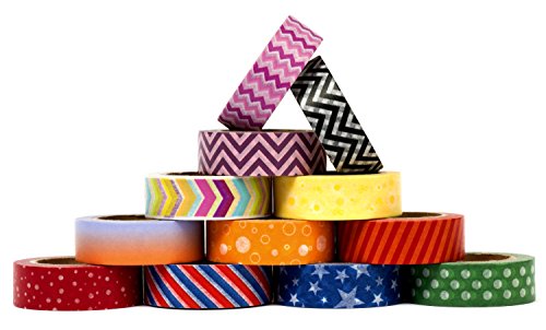 BEAUTIFUL VIBRANT COLORS: Rainbow themed set of 12 rolls of washi tape (15mm wide x 10 meters long). You will find aesthetically pleasing and fun designs within the main theme including dots, stripes, stars, arrows, and geometric shapes. Colors included are red, orange, pink, yellow, green, blue, purple, black, and white