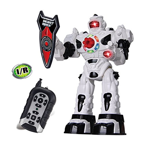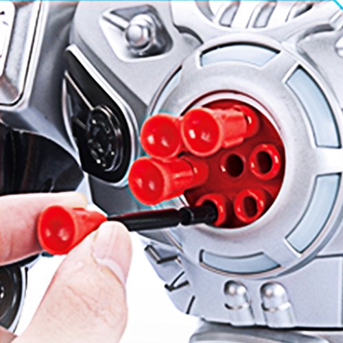 -. Feature : Fun playmate with remote control- My master could easily gives the order by pressing the controller button then I will enter fighting mode, dancing mode or silence mode. Talented as I am, I could bring a lot of fun and laughing for kids or adults. / Designed with emulational mechanical action- I have cool lighting effects and vivid fighting sound effects to make the most real and exciting fighting. Long-range cruise missiles make me an invincible ultimate weapon for players. / Shoots soft foam missiles- After loading my chest with 6 foam darts (2 extra are included in the pack in case you lose any) I am ready to stalk your unsuspecting target and fire! My missiles are soft so harmless to my master and pet. / High quality & safe material- I went through strict test to ensure my function and own many certificates such as EN71, EN62115, 7P, EN60825, EMC, ROHS, ASTM,HR4040. Please pick me to be your member. / Are you too occupied by the house errands to play with your dear kids? I could be the little nanny, keeping your kids occupied and happy for hours. You could also buy another version together so your kids could launch the robot attack.