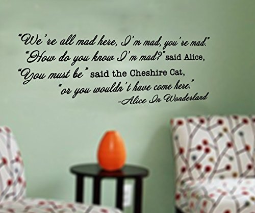 Cheshire Cat Alice In Wonderland Inspired We're All Mad Here Quote Vinyl Wall Decal [BLACK] by GMDdecals Size 30" x 12" Hatter Storybook Décor