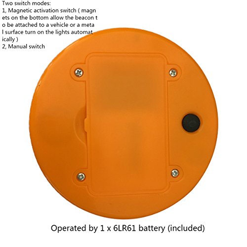 Two switch modes:1. Magnetic activation switch ( magnets on the bottom allow the beacon to be attached to a vehicle or a metal surface turn on the lights automatically ) 2. Manual switch , Runs continuously for up to 48 hours on one 6LR61 batteries(included)