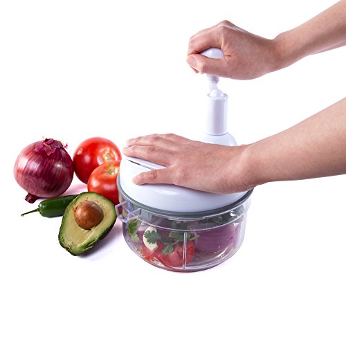 - SAFE & CONVENIENT – A great alternative to electric food choppers that can be bulky, noisy, expensive, and hard to clean. The chopper’s components come apart for easy cleaning. Just rinse with water after use and drip dry. Blades are concealed during operation for utmost safety. Chopper and all parts are made from BPA free food safe plastic.