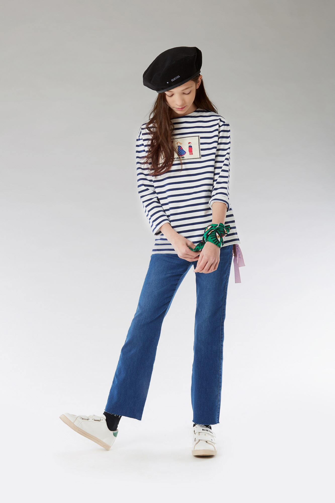 블루테일 로열티를 보여주는 스트라이프 위에 손에 손을 잡은 모양의 자수 패치로 하모니에 대한 이야기를 크래프트하게 표현했습니다.