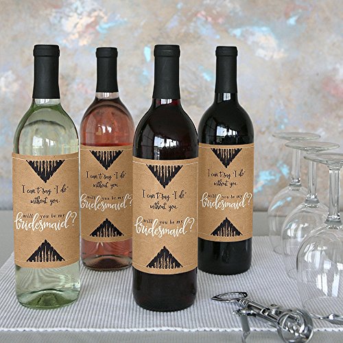 Studio : Big Dot of Happiness, LLC Publisher : Big Dot of Happiness, LLC Product Description Ask your best friends to be your bridesmaid with these fun "Will You Be My Bridesmaid?" wine bottle labels. Bridesmaid wine bottle labels come in a set of 4. They are professionally printed on waterproof sticker paper. Will You Be My Bridesmaid wine labels fit standard sized wine and liquor bottles. They are easy to apply and will make a unique bridesmaid gift. (Instructions for Applying Your Beverage Stickers STEP 1: Line up your label to ensure it is straight. Use the bottle seam (if removing original label) or the edge of the original label. STEP 2: Starting at the side, lightly attach taking care to make it straight. STEP 3: Once the edge is straight, firmly attach and roll the bottle while smoothing the entire label. Tips for Using Your Beverage Stickers: For best results, remove original label but sticker labels will attach over existing labels if you choose to leave them. Attach to dry bottle for smoothest results. If beverage is to be served chilled, attach label while room temp and then refrigerate. (Wine in image is obviously NOT included). 0