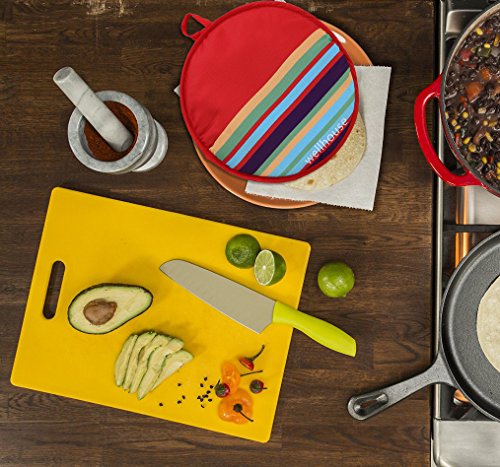 Are you ready for a Mexican dinner with family and friends? With Planet Household 12" Tortilla Warmer we are offering you a unique designer piece, which besides being a great presentation piece, it's the greatest way to heat tortillas. With its inner 9.5 inches diameter, this beautiful kitchen accessory can comfortably hold fresh and deliciously warm up to one hour the most common sizes of tortillas, tacos, flat breads, wraps, rolls and more. Made out of the highest quality food grade materials available our Tortilla Warmer prevents soggy tortillas so that you can enjoy hot & fresh tortillas throughout your entire meal. And that's not all - our Free eBook offers you 10 Delicious Quick & Easy Homemade Tortilla and Taco Fillings Recipes so you can enjoy an authentic tasty experience with family and friends For excellent results just follow the instructions printed on the backside of the Planet Household Tortilla Warmer and you will wonder how you ever survived without one.Feature