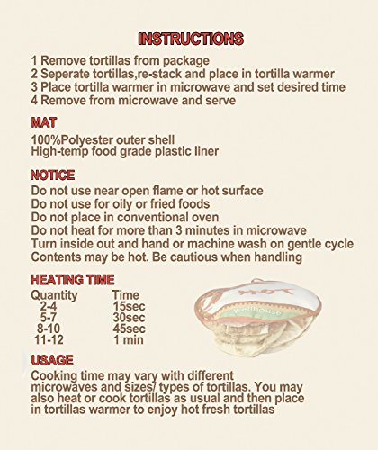 KEEP WARM TIME:high Temp Polyester Insulated Interior Liner Keeps Tortillas Heated for up to an Hour; For Microwave Use Only, Not Conventional Ovens.