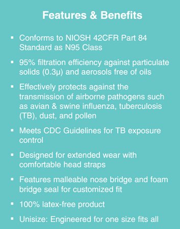 -. Feature : Conforms to NIOSH 42CFR Part 84; Standard as N95 Class. / 95% filtration efficiency against particulate solids (0.3µ) and aerosols free of oils / Effectively protects against the transmission of airborne pathogens such as avian & swine influenza, tuberculosis (TB), dust, and pollen / Meets CDC Guidelines for TB exposure control / 100% latex-free product
