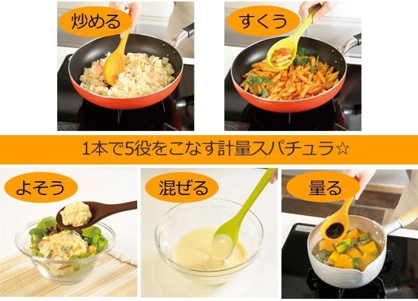 | 小さじ1と大さじ1の目盛が付いた計量スパチュラ♪液体調味料を量りながら、そのまま炒めたり、混ぜたりできます。全体がシリコーン製なので、フライパンや鍋などの金属を傷つけません。 |