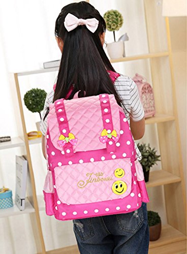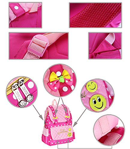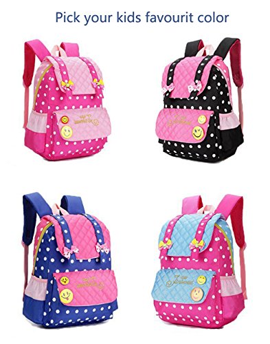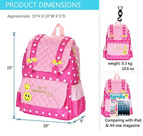 Product Description Approximate Dimensions of the backpack: 15" H X 10" W X 5" D. This lightweight backpack with dots print is perfect for preschool aged kids' daily use. This day pack has 2 different size compartments and pockets: one main compartment and a small front pocket. These provide roomy space for storage. Most of kids' daily necessities can be loaded, such as folder,water bottle,notebook,lunch box,extra clothes,etc. Plus, there are 2 mesh side pockets used as water bottle holder. These different compartments and pockets will help keep children organized. The high quality zippers can keep daily gear safe.On the back, the 2 adjustable S-shape shoulder straps are nicely padded, very comfortable and convenient to carry. On the top,there is a handle on the top and a strap to hang up the schoolbag in the classroom. Notice: Due to monitor variations,colors may appear slightly different. Washing instructions: - Washing with clean water with ordinary temperatures. - DO NOT washing with hot water. - Hang to dry. - Washing separately to avoid staining.