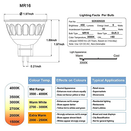 Excellent performance: 5w MR16 LED bulbs give off 450lm comfortable 3000K warm white light; a perfect 50w halogen bulb replacement, only for indoor use