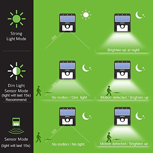 THREE INTELLIGENT MODES OPTIONAL: Strong long light mode suits for the backyard, patio, front door, back door. Dim light sensor mode suits for driveway, balcony railing, entryway. Strong light sensor mode for path, fence, garage. Choose the perfect mode for security!