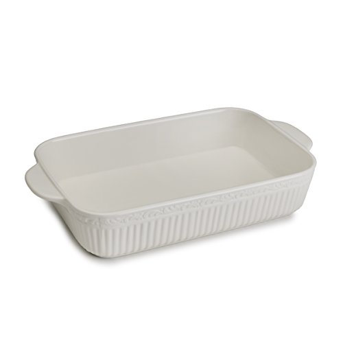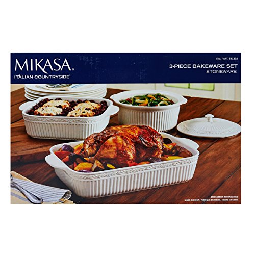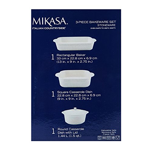The fluted bands and column-like detailing of this dinnerware recall classical Italian architecture. A best selling pattern, Italian Countryside by Mikasa has a complete suite of accessories available to create a classically stylish casual dining statement. Quality crafted from durable stoneware. Dishwasher, microwave, freezer and oven safe up to 500 degrees F. 3-piece bakeware set includes (1) each: 13-inch x 9-inch rectangular baker, 9-inch square casserole, and 1-1/2 quart covered casserole.