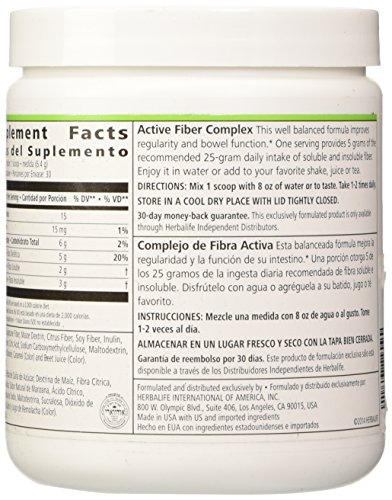 -. Binding : Health and Beauty -. Brand : Herbalife -. Color : White -. EAN : 0700254967851 -. Feature : Supports regularity and healthy digestion with this fiber powder. / Promotes regularity and healthy bowel movement. / Promotes growth of friendly intestinal bacteria. / One serving provides 5g of the recommended 25- to 35-gram daily intake of soluble and insoluble fiber. / Contains soluble and insoluble fiber to minimize bloating. Most people eat half the recommended daily dietary fiber intake. Fiber is important for weight management and intestinal health. -. HazardousMaterialType : Unknown -. IsAdultProduct : 0 -. Label : Herbalife -. LegalDisclaimer : Comments about this product are those of the manufacturer and not this seller. -. Manufacturer : Herbalife -. MPN : SKU 2864 -. NumberOfItems : 1 -. PackageQuantity : 1 -. PartNumber : SKU 2864 -. ProductGroup : Health and Beauty -. ProductTypeName : HEALTH_PERSONAL_CARE -. Publisher : Herbalife -. Size : Small -. Studio : Herbalife -. Title : HERBALIFE ACTIVE FIBER COMPLEX APPLE FLAVOR 6.7 OZ -. UPC : 311645000233