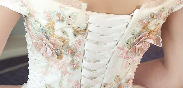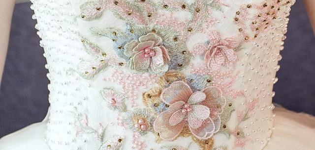 カラーの3D花と真珠でできたトップのオフショルダードレス。