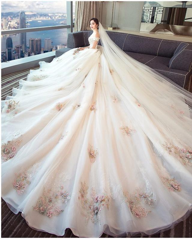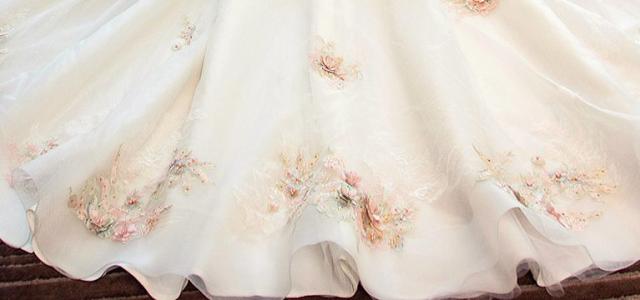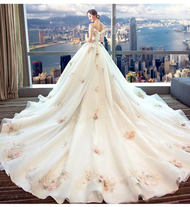 ロングトレーンの裾までゴールド刺繍花を咲かせ、華やかなヒロインに。