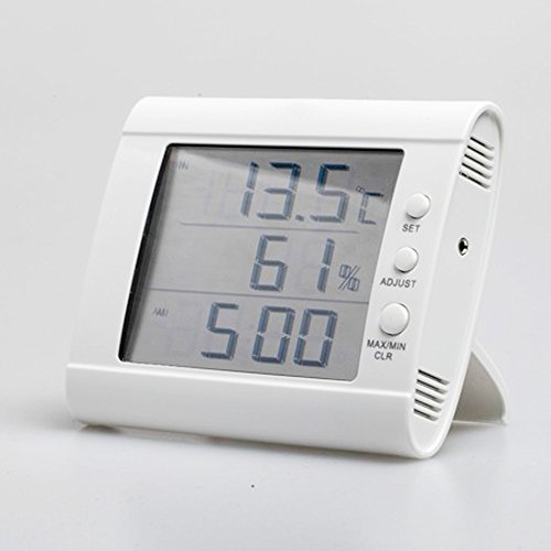 - Feature : Large display of Humidity, indoor/outdoor Temp(C/F) and Time(12/24-hour) / Device: 4.3x 3x 1; Display: 3x 2.4. Remote Probe: 3 meters (10 feet) / Built-in stand for sitting on a desk with multiple view angles. Or mount on wall / Recalls minimum and maximum readings / Requires 1x 1.5V AAA battery (not included).