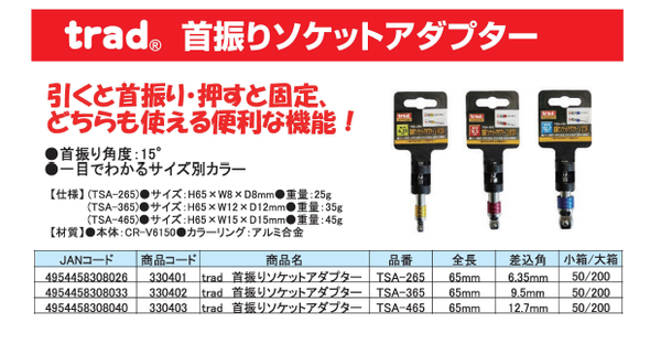 【商品名】 (業務用30個セット) TRAD 首振りソケットアダプター/作業工具 【差し込み角:9.5mm】 全長:65mm TSA-365 3/8 〔DIY 日曜大工〕 【ジャンル・特徴】 引くと首振り・押すと固定、どちらも使える便利な機能。 ■サイズ・色違い・関連商品■差し込み角:12.7mm 5個セット■差し込み角:12.7mm 15個セット■差し込み角:6.35mm 10個セット■差し込み角:6.35mm 30個セット■差し込み角:9.5mm 10個セット■差し込み角:9.5mm 30個セット[当ページ] ■商品内容 【ご注意事項】・この商品は下記内容×30セットでお届けします。首振り角度:15°。 一目でわかるサイズ別カラー■商品スペック【仕様】●サイズ:H65xW12xD12mm ●重量:35g【材質】●本体:CR-V6150 ●カラーリング:アルミ合金 全長:65mm 差し込み角:9.5mm■送料・配送についての注意事項●本商品の出荷目安は【1 - 7営業日 ※土日・祝除く】となります。●お取り寄せ商品のため、稀にご注文入れ違い等により欠品・遅延となる場合がございます。