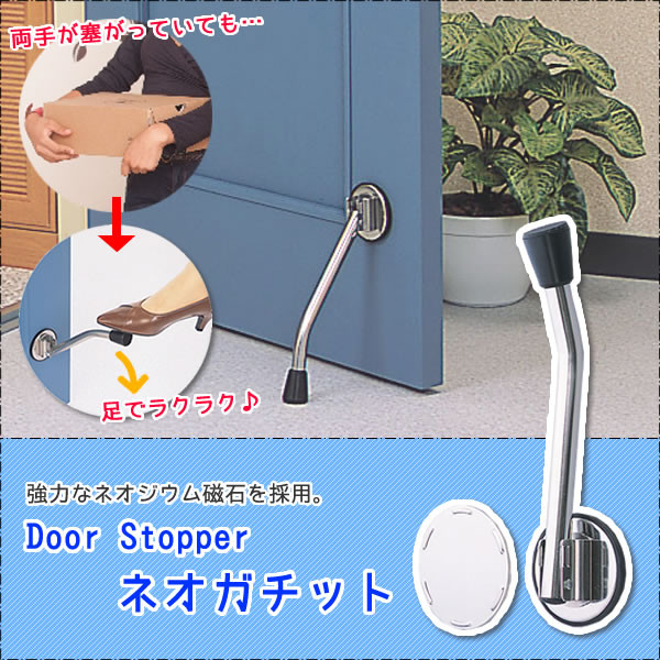 | ステンレス製のドアストッパー。強力なネオジウム磁石でスチールドアに吸着、ズレの少ない磁石カバーと、 大型の脚ゴムでしっかりと止め、お好みの位置でドアを開放できます。補助板付で木やアルミのドアでもOK! |