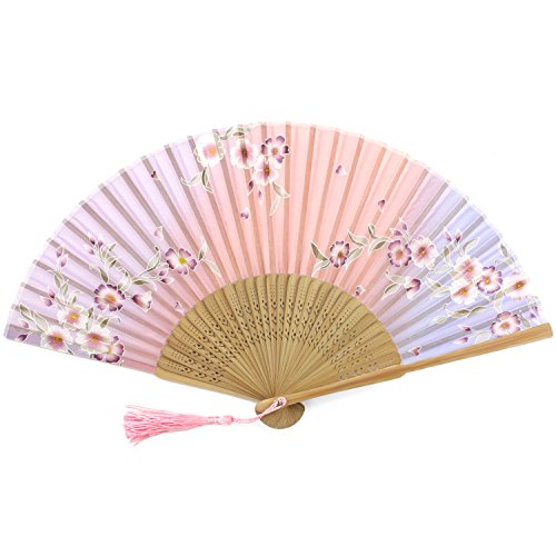 Perforated Wood Folding Fan - Cherry Blossom Print Fabric - Soft Violet & Pink