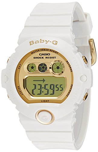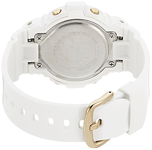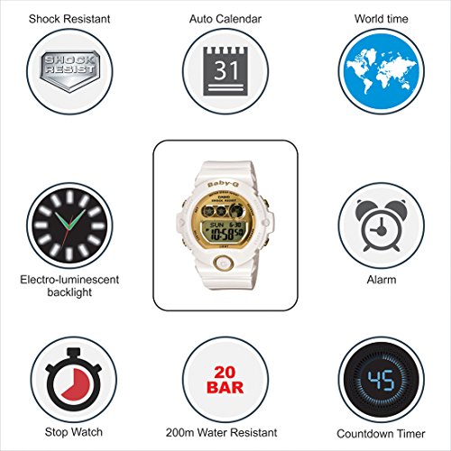 Brand, Seller, or Collection Name:Casio Model number:BG-6901-7DR (B153) Part Number:BG-6901-7DR (B153) Model Year:2016 Item Shape:Round Dial window material type:Mineral Display Type:Digital Clasp:Buckle Case material:Plastic Case diameter:41 millimeters Case Thickness:12 millimeters Band Material:Plastic Band length:Women's Standard Band width:19 millimeters Band Color:White Dial color:Gold Calendar:Yes Special features:Luminous Item weight:1.60 Ounces Movement:Quartz Water resistant depth:200 Meters