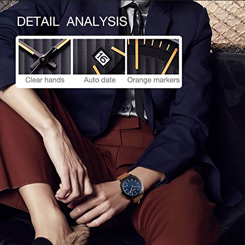 CLASSICAL BUSINESS LOOKING: Simple Black Dial, fine art plating case, elegant leather band strap, lead you to classic and business simplicity fashion. This is a perfect business casual dress watch for mens.