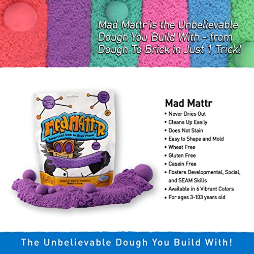 UNIQUE, NOT-TOXIC FORMULA: Mad Mattr's unique, non-toxic formula is gluten-, casein- and wheat-free, and available in 6 colors that can be mixed together, too! Plus, Mad Mattr never dries out no matter how long it is left out. So, it can be used over and over again, providing endless, fun-filled hours of stretchy, open-ended play. For Ages 3 and up.