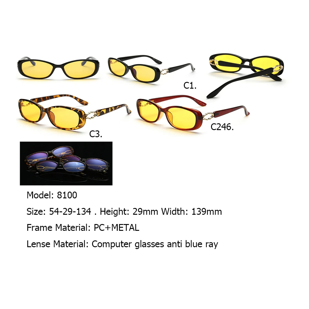 Model Number: 8100 Hinge Material of Cat Eye Glasses: Quality Hinge Lense Material of Cat Eye Glasses: Computer glasses CR-39 Resin Amber Lenses Frame Material of Cat Eye Glasses: High Quality PC Frame length of Cat Eye Glasses: 139mm Frame height of Cat Eye Glasses: 29mm Bridge of Cat Eye Glasses: 29mm Temple of Cat Eye Glasses: 134mm Production Method of Cat Eye Glasses: HANDMADE Support service of Cat Eye Glasses: Retail,Wholesale,Dropshipping LOGO: IVSTA OR OEM can print or laser your own logo