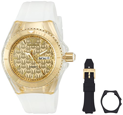 Stainless steel case with a gold transparent plastic cover with a white silicone strap. Uni-directional rotating gold-plated bezel. Gold dial with luminous gold-tone hands and Roman numeral hour markers. Minute markers around the outer rim. Dial Type: Analog. Luminescent hands and markers. Date display at the 6 o'clock position. Chronograph - three sub-dials displaying: 60 second, 60 minute and 24 hour. Quartz movement. Scratch resistant sapphire crystal. Screw down crown. Solid case back. Case diameter: 40.57 mm. Case thickness: 13 mm. Round case shape. Band width: 26 mm. Band length: 8.25 inches. Tang clasp. Water resistant at 200 meters / 660 feet. Functions: chronograph, date, hour, minute, second. Additional Info: in general, suitable for professional marine activity and serious surface water sports, but not diving. Casual watch style. Technomarine Cruise Monogram Gold Dial White Silicone Unisex Watch 115061.Feature