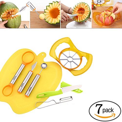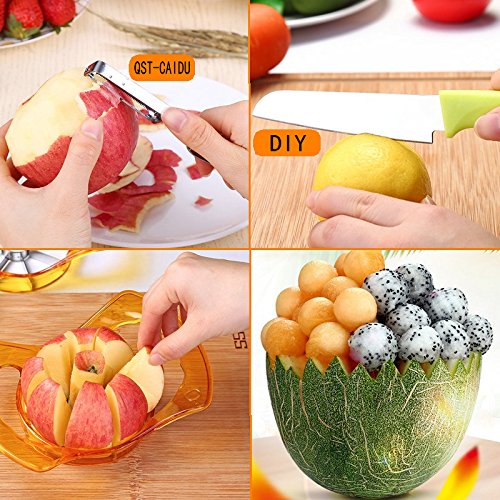 - ✔ Products include: ✭Apple cut x1, ✭fruit knife x1,✭ Paring knife x1,✭ Fruit chopping block x1, ✭ Melon Baller x1, ✭ Carving Knife x1, ✭Fruit Scoop x1