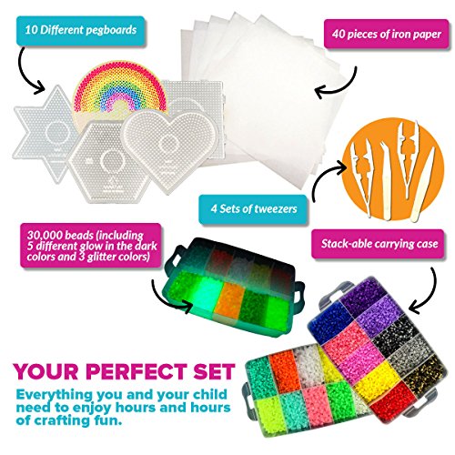 THE MOST COMPLETE FUSED BEAD KIT ON AMAZON - Everything you and your child need to enjoy hours and hours of crafting fun. The supplies in our set include 30,000 beads (including 5 different glow in the dark colors, and 3 glitter colors), 10 different pegboards, 4 sets of tweezers, 40 pieces of iron paper, and a carrying case with stacking trays. Works great with Perler beads.