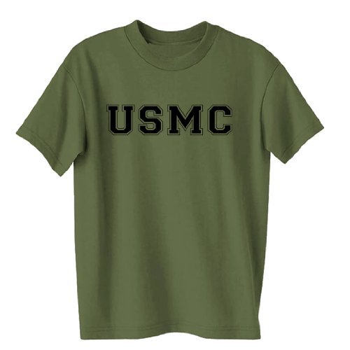 Product Description Military Style Physical Training Military Green T-shirt. Features "USMC" on the front chest. Taped neck and shoulders. Double-stitched sleeve and bottom hems, quarter-turned body. 0