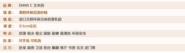 毯面:高档环保尼龙纱线           毯底:天然环保防滑乳胶          特点:防滑 吸水 吸尘 易洗 环保