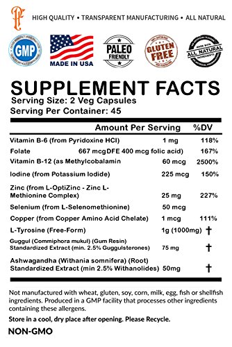 Underactive Thyroid Support With Iodine, Tyrosine, Guggul and Ashwagandha. Nutrients for thyroid health and energy