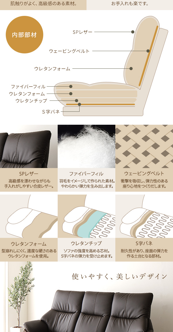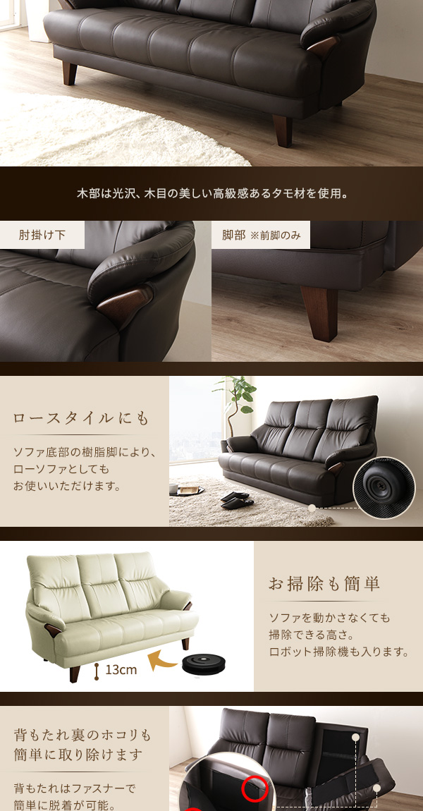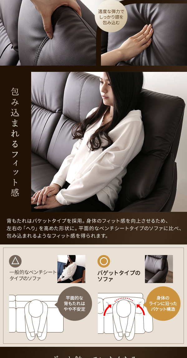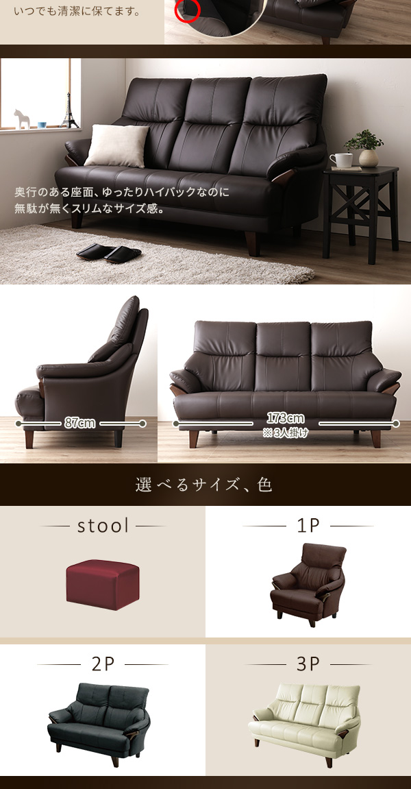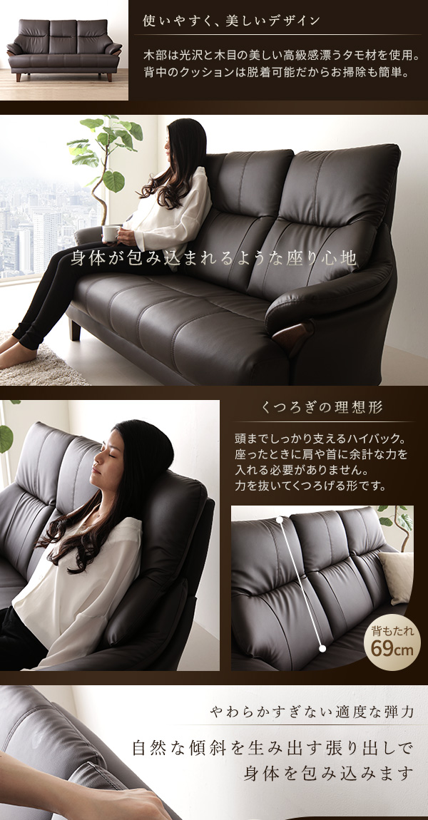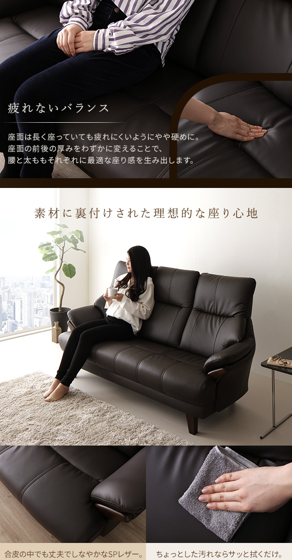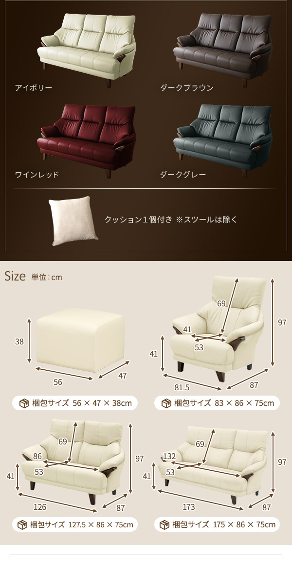 本商品はお取り寄せ商品のため、稀にご注文入れ違い等により欠品・遅延となる場合がございます。誠に恐れ入りますが、何卒ご了承ください。 また、以下の場合には追加送料がかかる場合がございます。  ・大型商品の複数購入時 ・同梱区分が異なる商品の複数購入時  【出荷目安】:1 - 5営業日 ※土日・祝除く 【同梱区分】:TS 2140 【梱包サイズ】:大型商品 【代引き決済】:不可  配送伝票の依頼主は出荷元(メーカーもしくは仕入元)名となる場合がございますので、お受け取りの際はご注意ください。   ■ポイント1 快適なハイバック仕様 頭をしっかり支えてくれるハイバック構造で首に負担を掛けにくい造りです。 さらに背中は体にフィットするバケットタイプで、包み込まれるような 心地よさを味わえます。  ■ポイント2 お手入れラクラク 張り地にSPレザーを使用しているので、うっかり汚してしまっても すぐに拭き取る事ができます。定期的なメンテナンスで長く お使いいただけます。  ■ポイント3 豊富なカラーバリエーション アイボリー、ダークブラウン、ダークグレー、ワインレッドのシックで 落ち着いたカラーバリエーションは、どんなお部屋にも合わせやすく、 高級感を与えてくれます。  ■ポイント4 お得なハンドクッション付き より心地よく座っていただくために、ハンドクッションを1つお付けします。 抱きかかえるもよし、腰に敷くもよし。過ごしやすさのお手伝いをします。   ■本体サイズ・重量(約) 一人掛け 外寸:幅81.5cm × 奥行き87cm × 高さ97cm(座面高54cm)(座面奥行き50cm) 28kg  二人掛け 外寸:幅126cm × 奥行き87cm × 高さ97cm(座面高54cm)(座面奥行き50cm) 33kg  三人掛け 外寸:幅173cm × 奥行き87cm × 高さ97cm(座面高54cm)(座面奥行き50cm) 35kg  スツール 外寸:幅56cm × 奥行き47cm × 高さ38cm 6.5kg  付属クッション(38cm×38cm)  ■梱包サイズ・重量(約) 一人掛け ・梱包サイズ:幅83cm × 奥行き86cm × 高さ75cm ・梱包重量:30kg  二人掛け ・梱包サイズ:幅127.5cm × 奥行き86cm × 高さ75cm ・梱包重量:35.5kg  三人掛け ・梱包サイズ:幅175cm × 奥行き86cm × 高さ75cm ・梱包重量:39kg  スツール ・梱包サイズ:幅56cm × 奥行き47cm × 高さ38cm ・梱包重量:7.5kg  ■カラー: アイボリー、ダークグレー、ダークブラウン、ワインレッド  ■素材: 構造部材  :PVC 木部(前面):タモ材 内部構造  :Sバネ、ウェービングベルト 張地    :表地 SPL /PVC(合皮) 中材    :背  シリコンフィル、ウレタン        座面 ウレタン  ■生産国:中国  【注意事項】 ●本商品は、北海道・沖縄・離島への配送はいたしかねます。あらかじめご了承ください。 ●こちらの商品は日祝の配達、配達時間帯指定を承ることはできません。 ●お客様による組立品となります。