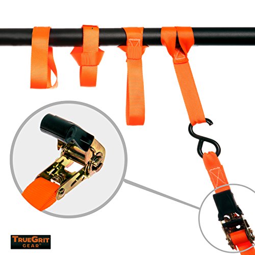 ✅ DEPENDABLE QUALITY – TrueGrit Gear is an American company and each of our ratchet tie downs includes 15 feet of polyester/nylon webbing strap, double J hooks, rubber-coated S hooks, and ergonomically designed premium handles with ratchet mechanism that will not bind or slip.