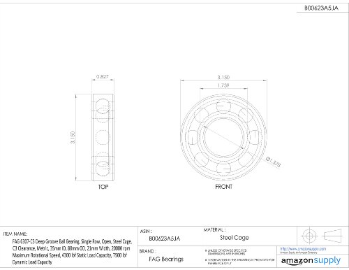 FAG 6307-C3 Deep Groove Ball Bearing, Single Row, Open, Steel Cage, C3 Clearance, Metric, 35mm ID, 80mm OD, 21mm Width, 20000 rpm Maximum Rotational Speed, 4300 lbf Static Load Capacity, 7500 lbf Dynamic Load Capacity