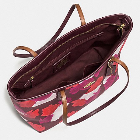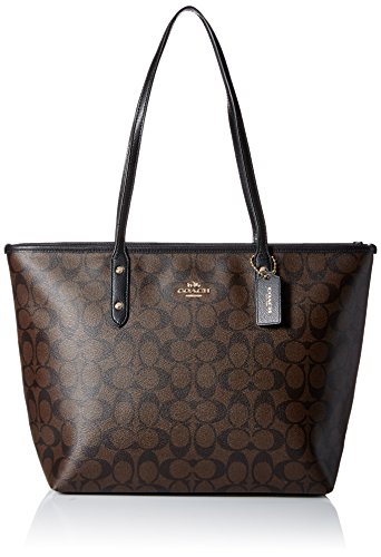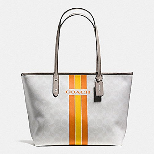 -. Brand : Coach -. Color : Im/ Khaki Watermelon -. Department : womens -. Feature : Signature khaki coated canvas with watermelon and purple colored stripes / Brown leather trim; Gold tone hardware / Zip top closure and fabric lining / Inside zip and slip pockets; Handles drop 10" / Approx. measures 17 3/4" (L) x 10" (H) x 5.5" (W) -. Model : F38405 -. ProductGroup : Shoes -. ProductTypeName : HANDBAG -. Title : Coach City Zip Tote
