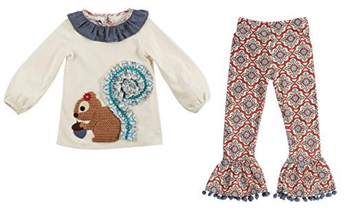 2-piece set. Cotton interlock tunic with squirrel applique with dimensional ruffle tail, chambray ruffle neckline and keyhole back. Comes with printed cotton spandex leggings with ruffle and pom-pom trim at hem.