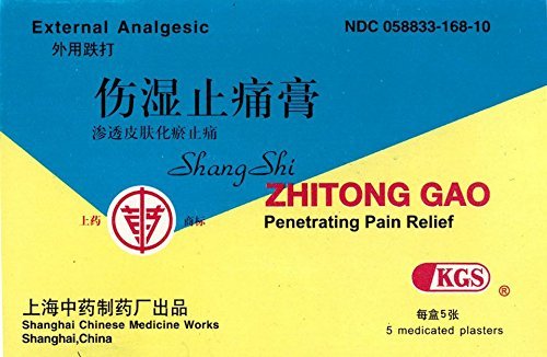 -. Binding : Health and Beauty -. Brand : Shang Shi Zhitong Gao -. Feature : Penetrating pain relief herbal plaster / For temporary pain relief of minor muscle aches and pains / Pain relief of simple backaches, arthritis, strains, sprains and bruises / Chinese herbal patch / For sprains, bruising and strains -. Label : Shanghai Chinese Medicine Works -. Manufacturer : Shanghai Chinese Medicine Works -. ProductGroup : Health and Beauty -. ProductTypeName : HEALTH_PERSONAL_CARE -. Publisher : Shanghai Chinese Medicine Works -. Studio : Shanghai Chinese Medicine Works -. Title : Shang Shi - Zhitong Gao - Penetrating Pain Relief - Medicated Plasters (5 plasters) (Genuine Kingsway Trading Inc. Product) - Box