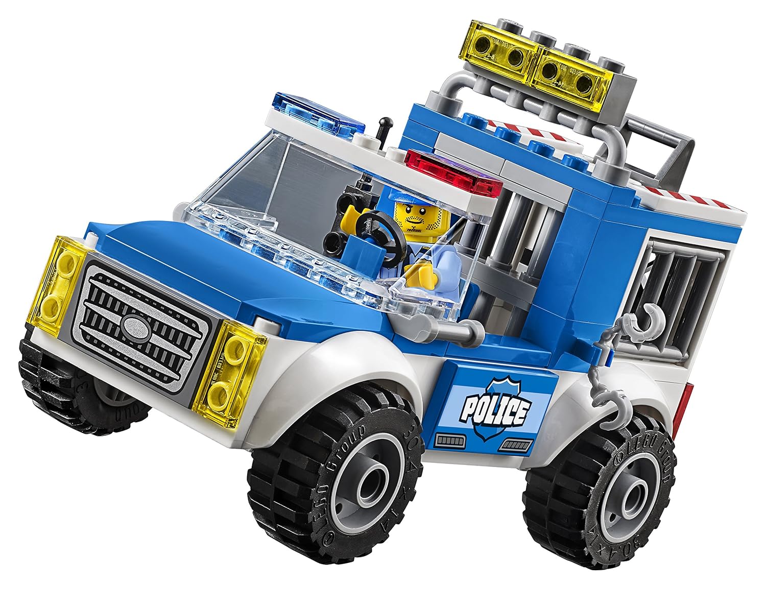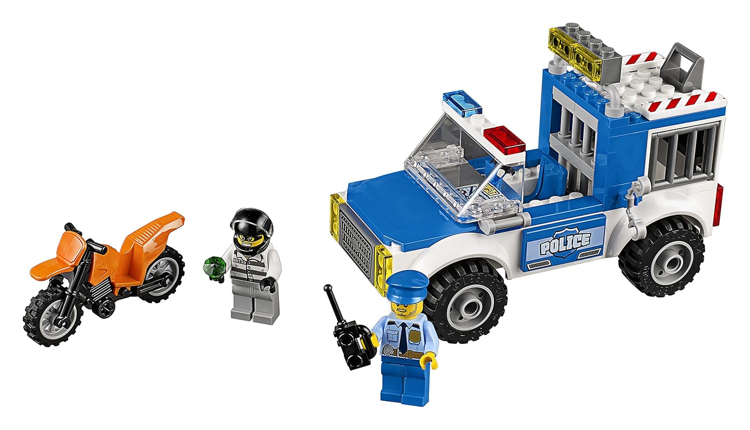 ●Police truck features a holding cell in the back that opens from the top with space for a minifigure and a roadblock with a swinging gate.
