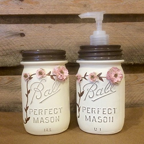-. Title : Shabby Chic Ivory and Rose Vintage Mason Jar Bathroom or Desk Set with Soap Dispenser and Toothbrush or Pen and Pencil Holder