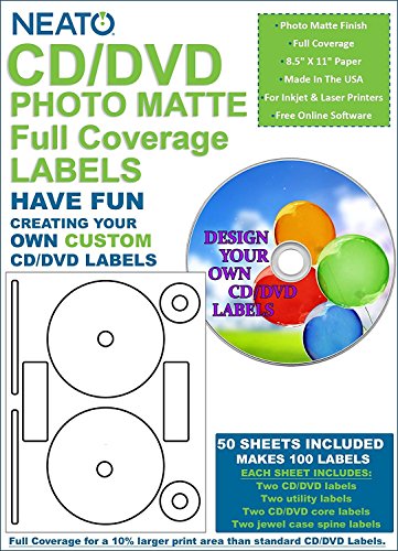 PRODUCT SPECIFICATIONS: Package contains (1) Neato CD/DVD PhotoMatte Full Coverage Labels– 50 Sheets – Makes 100 Labels. Each sheet includes (2) CD/DVD labels with 15mm center hole, (2) utility labels, (2) CD/DVD Core Labels, and (2) Jewel Case Spine Labels. Each sheet measures 8.5” x 11” total. Includes free access code to Neatos Online Design Software. Made in the USA.