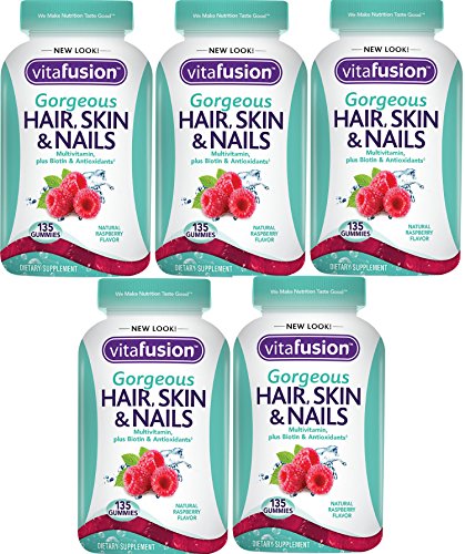 -. Binding : Health and Beauty -. Feature : High potency Biotin and Antioxidant Vitamins C and E -. IsAdultProduct : 0 -. Label : Vitafusion -. Manufacturer : Vitafusion -. ProductGroup : Health and Beauty -. ProductTypeName : HEALTH_PERSONAL_CARE -. Publisher : Vitafusion -. Studio : Vitafusion -. Title : Vitafusion Gorgeous Hair, Skin and Nail Multivitamins with Natural Raspberry 135 gummies (pack of 5)