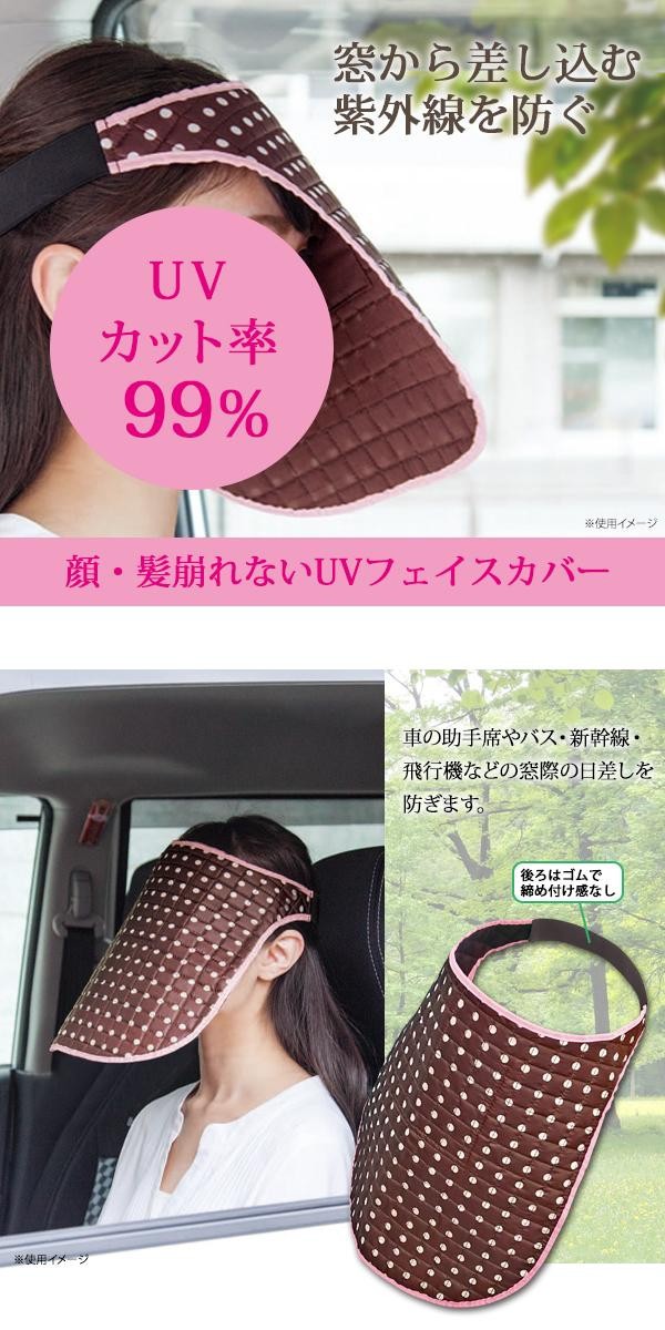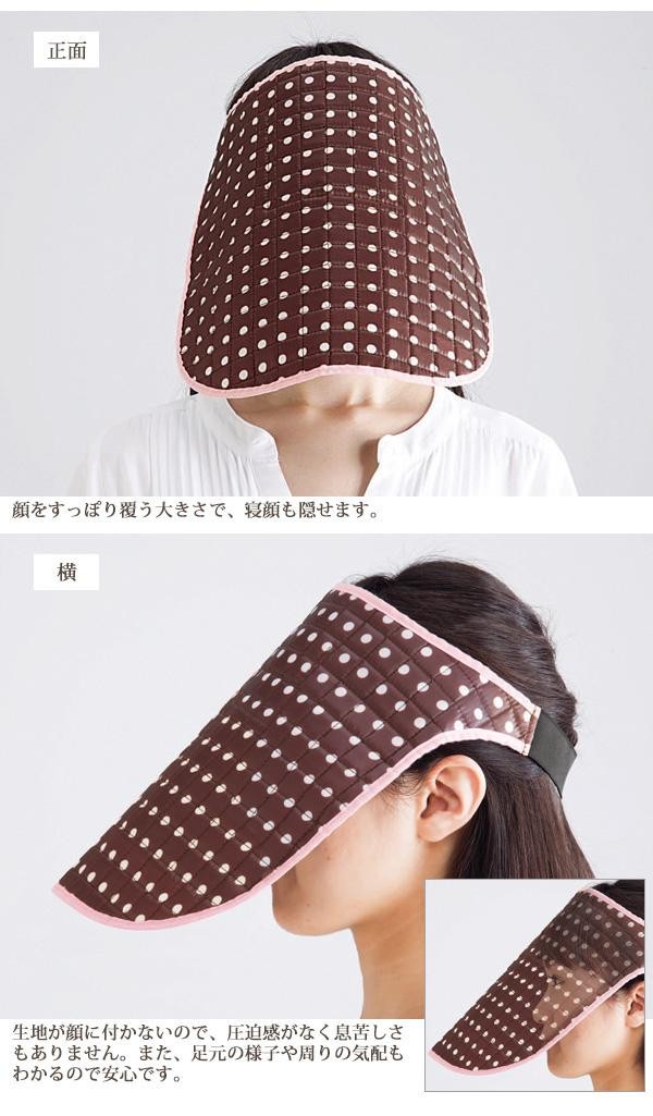 ゴム紐で頭にふんわり被せるだけで気軽にUVカットできるフェイスカバー。 UVカット率は99%!使わない時はコンパクトに折りたためて携帯にも便利です。サンバイザー/紫外線対策/紫外線カット/日除け/日よけ/つば広/折りたたみ/キルティング/水玉/寝顔/目隠し/安眠 |