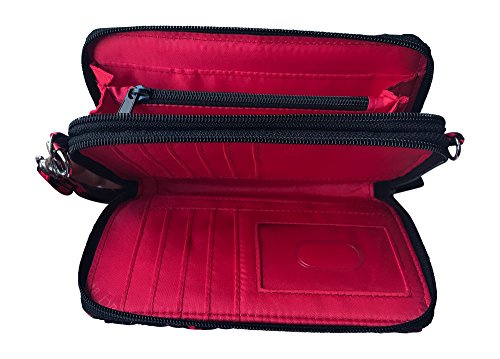 A second zippered compartment includes all the components of a well-organized wallet: a large bill pocket, eight credit card slip pockets, four slip pockets and an ID window
