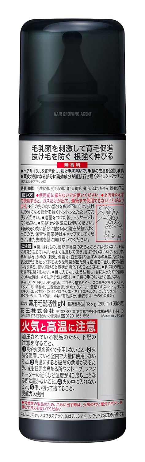 毛髪の成長を促す毛乳頭に働きかけ、抜け毛を防ぎ、毛髪の成長を促進する。有効成分【ニコチン酸アミド】と【生薬センブリエキス(スエルチアマリンKI)】が、頭皮の血行を促進し、抜け毛を防ぐ。有効成分【β-グリチルレチン酸】が頭皮環境を正常化し、フケ・かゆみを防ぐ。頭皮の気になる部分に薬効成分が直接行き届くダイレクトタッチ式。無香料。エアゾール製品です。お使いになる時や廃棄される時は、火気と高温にお気を付けください。