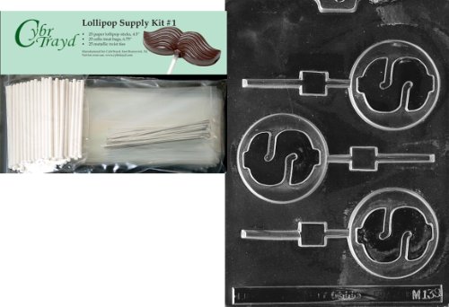 Cybrtrayd Dollar Sign Lolly Miscellaneous Chocolate Candy Mold with Lollipop Supply Bundle of 25 Lollipop Sticks, 25 Cello Bags, 25 Silver Twist Ties and Instructions