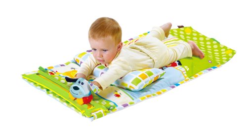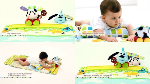 - Feature : Portable tummy time development mat / battery operated, motion track buggy - Easy attach track affixes to straps on mat / Includes two buggy attachable, multitextured Farm Figures - Cow and Dog / Hidden Pocket for additional accessories / Folds conveniently into a self contained Roll n Go carrying case for easy transport